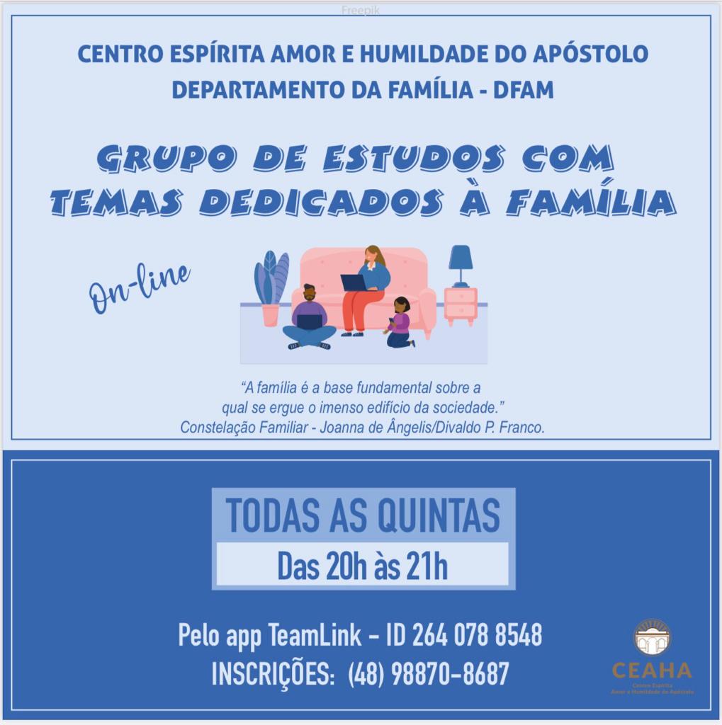 Se inscreva pelo número do cartaz e começe a estudar. É só entrar pelo app TeamLink – ID 264 078 8548, na sala Estudos Dep. da Família – DFAM. Entre no link: https://m.teamlink.co/2640788548