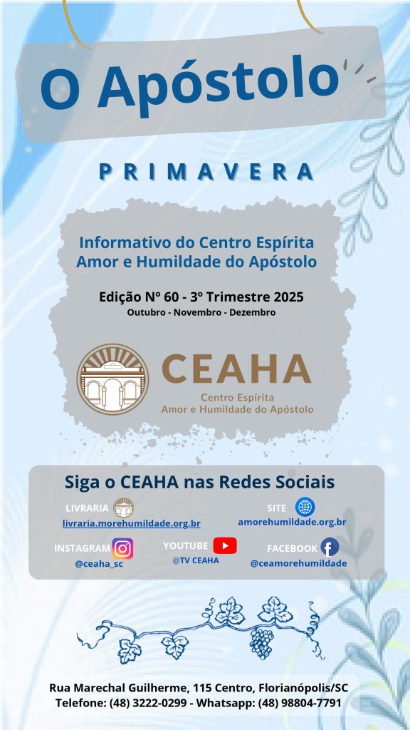 A 60ª edição do informativo O Apóstolo, publicada pelo Centro Espírita Amor e Humildade do Apóstolo (CEAHA), celebra a chegada da primavera com mensagens de fé, renovação e aprendizado espiritual. O conteúdo homenageia Allan Kardec, destacando sua trajetória como educador e codificador do Espiritismo, e reforça a importância do estudo aliado à transformação moral. Textos sobre saúde mental, baseados em O Livro dos Espíritos, ampliam a compreensão sobre a influência espiritual nos pensamentos, defendendo a união entre ciência e espiritualidade como caminho para o equilíbrio integral.